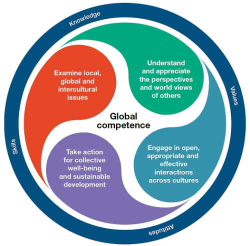 In die literatuur word die begrip globale bevoegdheid toenemend teëgekom (Bird, Osland en Lane 2004:57–80). Volgens die OECD PISA-raamwerk (Organization for Economic Co-operation and Development Program for International Student Assessment) vir globale bevoegdheid (sien die figuur hier onder) omvat globale bevoegdheid die verkryging van diepgaande kennis en begrip van globale en interkulturele kwessies; die vermoë om van ander mense te leer en saam met mense uit verskillende agtergronde te leef; asook die houdings en waardes wat nodig is om met respek met ander te kommunikeer. Globale bevoegdheid behels dus die vermoë om plaaslike, globale en interkulturele kwessies te ondersoek, om die perspektiewe en wêreldbeskouings van ander te verstaan en te waardeer, om oop, toepaslike en effektiewe interaksies met mense uit verskillende kulture te beoefen, en vir kollektiewe welstand en volhoubare ontwikkeling op te tree (Ramos en Schleicher 2018:6).
