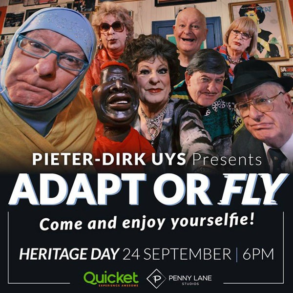 On Heritage Day, Thursday 24 September 2020 at 6pm, nearly 40 years after PW Botha gave him the show title Adapt or dye, Pieter-Dirk Uys is once again inspired by politicians, a Corona virus and our heritage in 2020 with Adapt or fly. Mrs Evita Bezuidenhout, “Kidi Amin” (Julius Malema), Pik Botha, Nowell Fine, Mrs Petersen, the old Krokodil, Madiba and that former dancing Prez come to the rescue. In a time of depression, recession, fear and social distancing, what is better and more healing than a good laugh at the expense of those who depress, recess, frighten and annoy us?