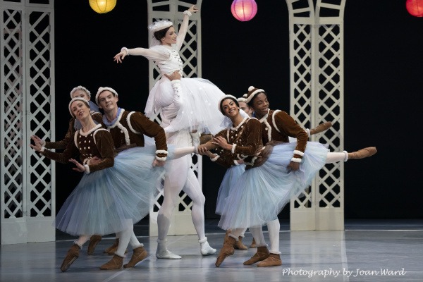 Les patineurs (The skaters) features a party of ice skaters on a frozen pond joyfully depicting Ashton's virtuosic choreography of charming divertissements in a beautiful trellised setting. Delightful in its humour and lyrical adagio of the lead couple, as the "spills and thrills" of the Blue Boy and friends show masterfully the multiple pirouettes and leaps. As the snow starts to fall the skaters glide away.