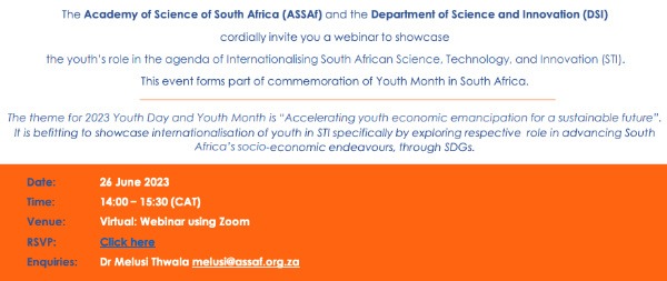 The Academy of Science of South Africa (ASSAf) and the Department of Science and Innovation (DSI) cordially invite you a webinar to showcase the youth’s role in the agenda of internationalising South African science, technology, and innovation (STI). This event forms part of commemoration of Youth Month in South Africa.