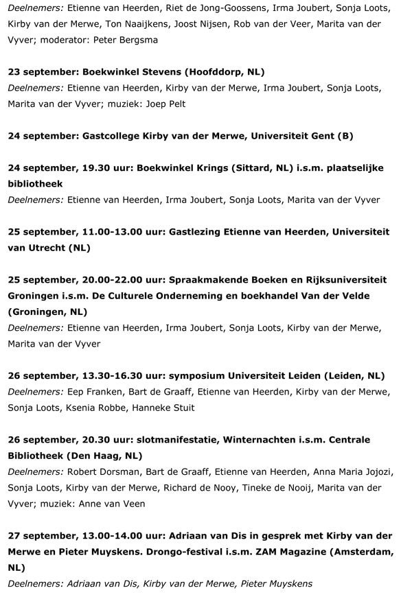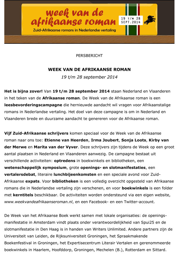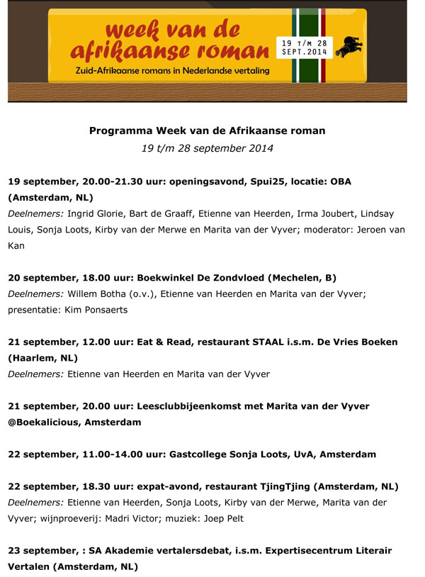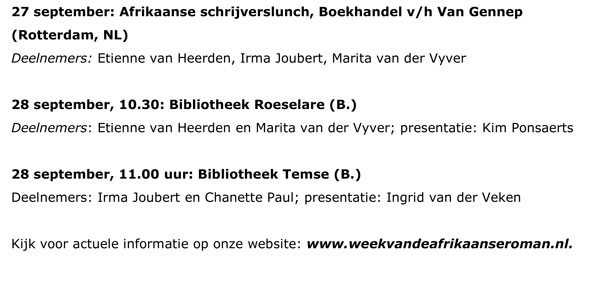 Van 19 t/m 28 september 2014 staan Nederland en Vlaanderen in het teken van de Afrikaanse roman. Vijf Zuid-Afrikaanse schrijvers zijn tijdens de Week van de Afrikaanse roman op een groot aantal plaatsen in Nederland en Vlaanderen aanwezig: Etienne van Heerden, Irma Joubert, Sonja Loots, Kirby van der Merwe en Marita van der Vyver.