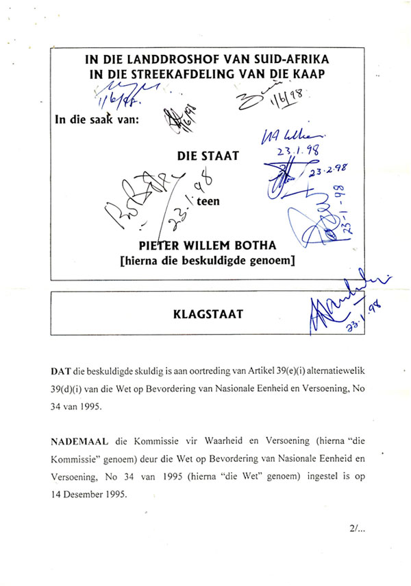 Op ‘n persoonlike noot: ek versamel al van kindsbeen af handtekeninge van bekendes en berugtes en het ‘n besondere belangstelling in dokumente van geskiedkundige belang. Met Botha se verhoor in die streekhof op George het ek nog as prokureur op daardie dorp gepraktiseer. Een van streeklanddros Victor Lugaju se assessore, was adv Burton Fourie SC (nou ‘n Kaapse regter wat dikwels as appèlregter waarneem). Ek het hom goed geken en ons het dikwels saam sake behartig. Hy was destyds so vriendelik om vir my ‘n afskrif van PW Botha se dagvaarding en die klagstaat te bekom en laasgenoemde deur ál die rolspelers – die landdros en sy assessore, die aanklaers, PW se regspan én PW self – te laat teken: