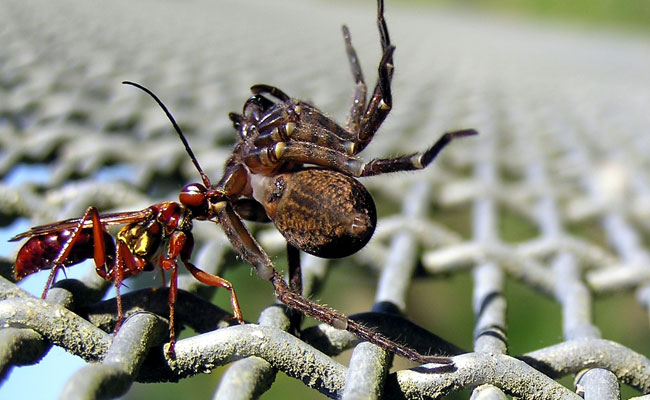 'n Spinnekopwespe wat 'n spinnekop nes toe dra (foto: wikipedia)