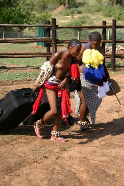 Ons word na Napoleon se kraal aangejaag. Ook daar kry ons stukkies vleis uit die vlamme en ’n koue bier uit ’n groot drom yswater. ’n Groepie vroue in swart geplooide rompe met eenderse blou en wit doeke om die skouers, bring borde vol rys en vars gesnyde tamaties. Ons kan regtig net nie meer eet nie, maar die dromme red ons. Oorverdowend word die skare tot stillstand gedwing. Almal storm vir ’n goeie uitsig. Die bruid en haar gevolg kom! Die dromme word mal toe twee jong meisies met swaar wielietjietasse tussen die bosse te voorskyn kom. Anna se lobola word afgelewer.