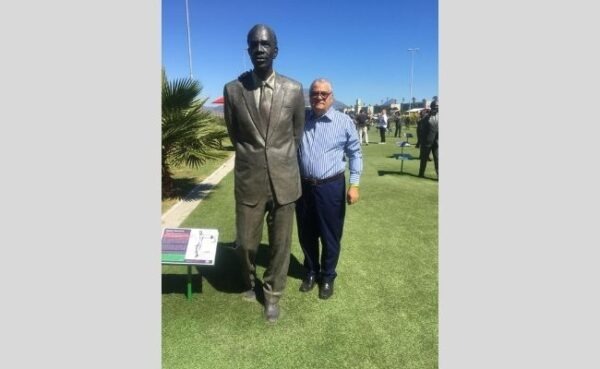Foto van die Robert Sobukwe-standbeeld by Canal Walk in Kaapstad langs Danie van Wyk: verskaf
