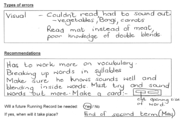 - Onderwysers moet dit oorweeg om RR tydens groepsbegeleide lees te gebruik, aangesien RR geldig, betroubaar en bestendig is om leesgedrag en leesfoute te identifiseer. Die uitkoms van RR-aantekeninge kan dus ’n onderwyser se leesonderrig ingee om in leerders se leesbehoeftes te voorsien. Die RR-strategie moet oor ’n tydperk gebruik word waar twee of drie leerders per dag geassesseer word.