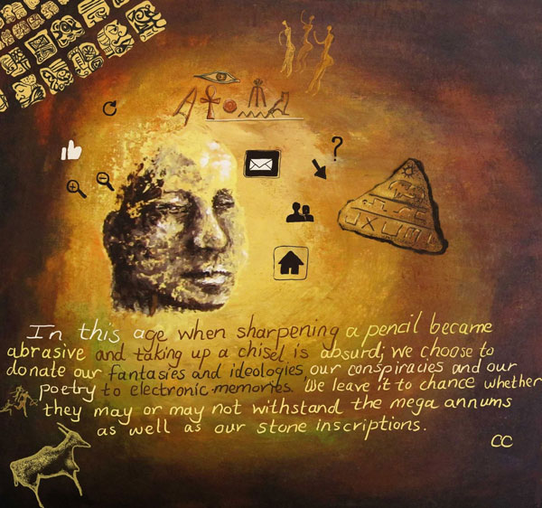 In this age when sharpening a pencil has become abrasive and taking up a chisel is absurd we choose to donate our fantasies and ideologies, our conspiracies and our poetry to electronic memories. We leave it to chance whether they may or may not withstand mega-annums as well as our stone inscriptions.
