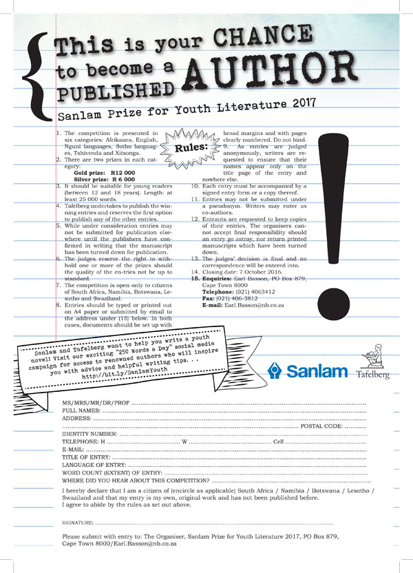 Entries for the 2017 Sanlam Prize for Youth Literature are now open!