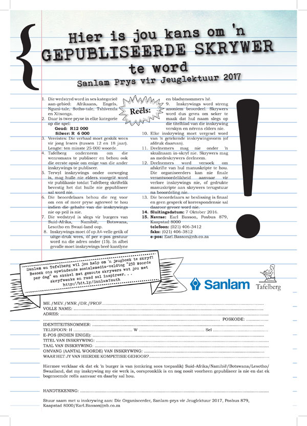 Inskrywings vir die 2017 Sanlamprys vir Jeuglektuur is nou oop!