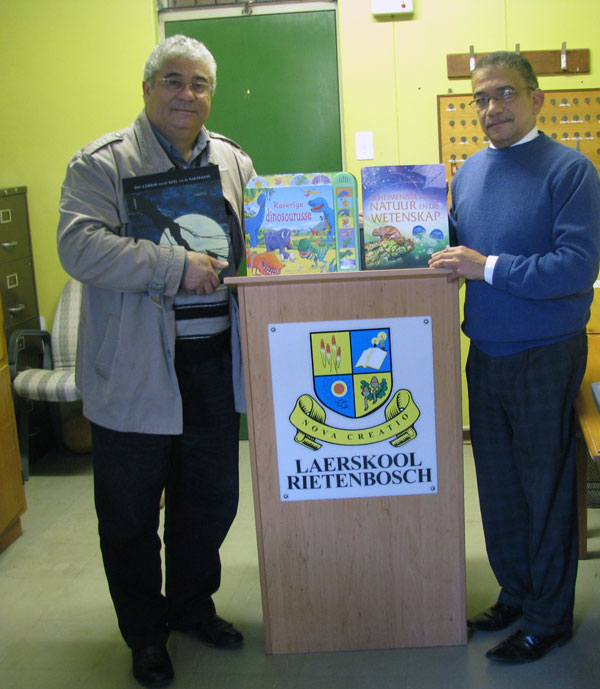 Die hoof uitvoerende beampte van die SBA, Danie van Wyk (links op die foto), oorhandig hier aan Roy van Rooyen (regs), skoolhoof van Laerskool Rietenbosch in Cloetesville, boeke met die oog op die toerus van die skool se biblioteek. Naomi Meyer van LitNet het die skool saam met Danie van Wyk besoek.