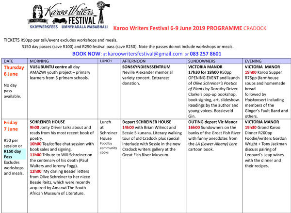 Here is the programme of the 9th Schreiner Karoo Writers' Festival – which takes place in Cradock from the 6th to the 9th of June 2019.