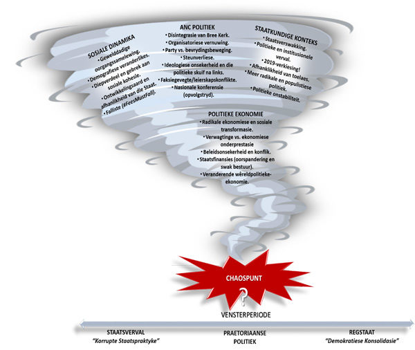 Lesers kan reeds my perspektief vanuit die voorgaande aflei. My kernscenario fokus op ’n politieke magspel en selfs oorlewingspel in ’n neopatrimoniale omgewing (daar waar Westerse praktyke en instellings enersyds en patrimoniale praktyke andersyds mekaar ontmoet) met as uitkoms ’n verswakkende staat met pretoriaanse karaktereienskappe – uitgelewer aan praktyke soos onder meer korrupsie en sy geïnstitusionaliseerde vorm van staatskaping. Binne hierdie groter narratief is verskeie taktiese scenario’s moontlik – te veel om hier te ontleed. Hierdie basisscenario kan nog op langer termyn voortbestaan. Die volgende diagram vat die kern van my perspektief saam: