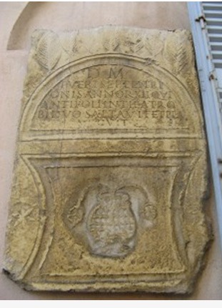 santDaarop is ’n teks uitgraveer: Aan die gode Mânes van die kind Septentrion, twaalf jaar oud, wat in die teater by Antipolis vir twee dae in die reën gedans het.    (Vertaling uit Frans van die Latyn)