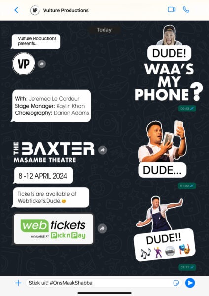 Die reën het gladdie vi Kaapstad weggejaa vi hierrie installment van Dude! Wa’s my phone?, ’n show deur Vulture Productions – ’n sequel vannie ee’ste award-winning show Dude! Wa’s my bakkie? Jeremeo Le Cordeur kom aan nou ’n lang pad innie theatre en entertainment industry en hy beweeg nog altyd met niewe idees! Na ’n paa festival runs, Dude! Wa’s my phone? nooi’rie education sector – albei studente en onnies – ommie show te kô kyk van 9 tot 12 April 2024, 11h00 byrie Baxter Masambe Teater in Rondebosch, Kaapstad, die teater waa ôs ee’ste in 2019 vi Jeremeo in action gesien! Bookings op Webtickets, R40 per ticket.