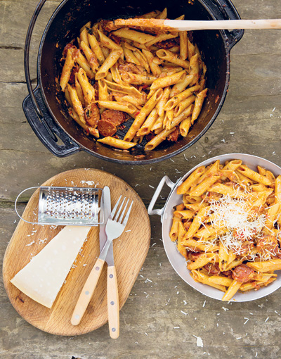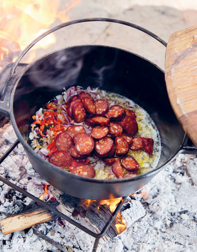 Hierdie resep kom van Dan. Sy vrou, Lindi, reken dis die beste maaltyd wat hy op die vuur maak. Dan en Lindi is gesoute reisigers en hy hou daarvan om hierdie ete in hul staatmaker-potjie aanmekaar te slaan wanneer hulle iewers heen op pad is. Die bestanddele is redelik eenvoudig en hierdie maaltyd sal beslis lekker werk as jy kamp of op die stoep van jou hut sit met ’n uitsig oor ’n pragtige stuk Suid-Afrikaanse landskap. Chorizo is ’n gekruide Italiaanse salami-worsie en deesdae wyd verkrygbaar in Suid-Afrika. As jy dit nie in die hande kan kry nie, vervang dit maar net met enige salami wat beskikbaar is.