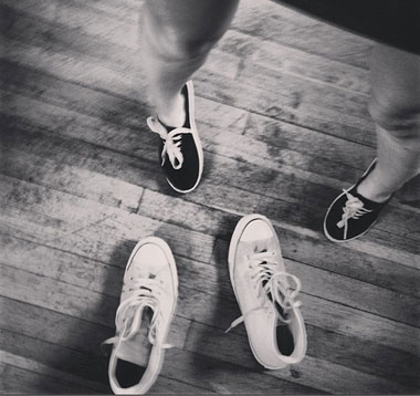 hy’t pienk tekkies aan en