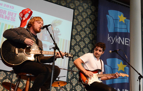 Van Coke Kartel: Francois van Coke speel sy rooi Coke-keppie van sy kop af. Hier saam met Jedd Kossew in die Karoo Kafee.