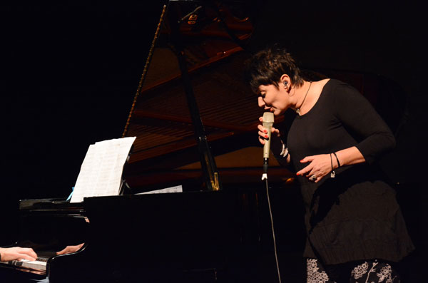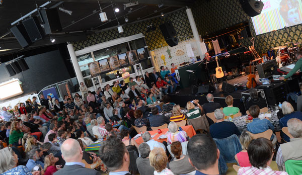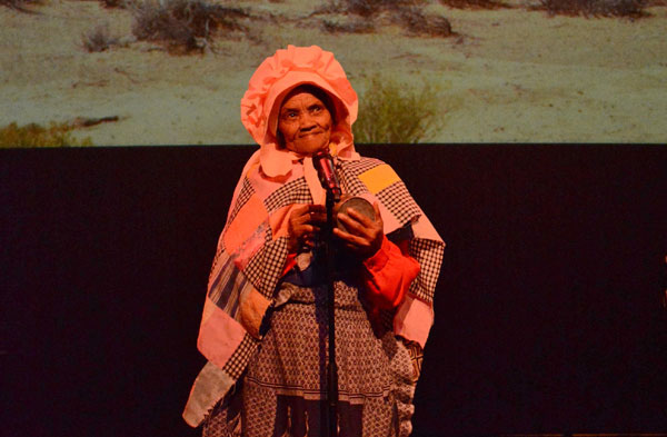 Artistieke direkteur Carina Classens gaan sit langs volksanger Mary Kriel nadat die kunstenaars haar persoonlik bedank het. Aktrise Vinette Ebrahim en teelepel-glykitaarspeler Hannes Coetzee (agter links) kyk toe.
