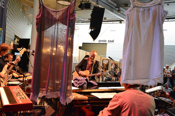 Stef Bos speel klavier in die voorportaal van die Theater aan het Spui.