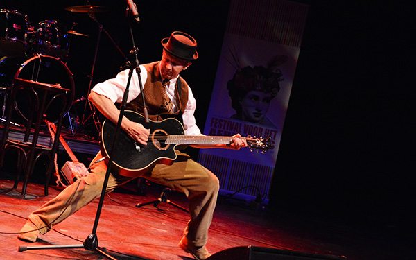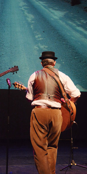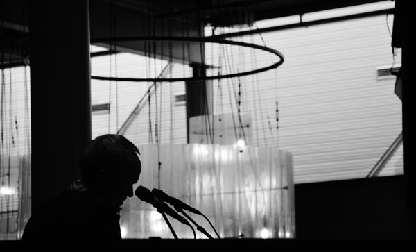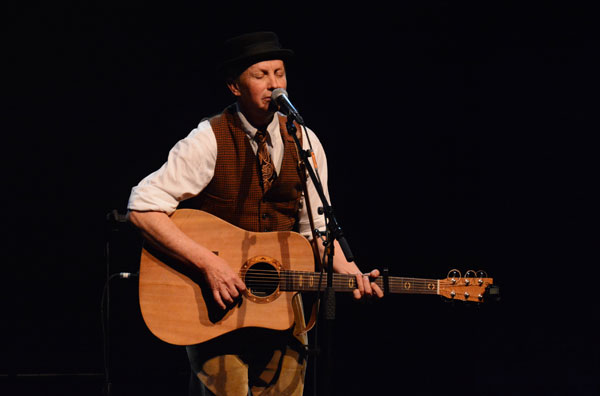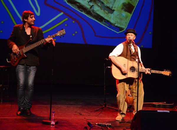 Etienne van Heerden lees, op die maat van Schalk Joubert en David Kramer se musikale improvisasies, slothoofstukke uit sy romans voor.