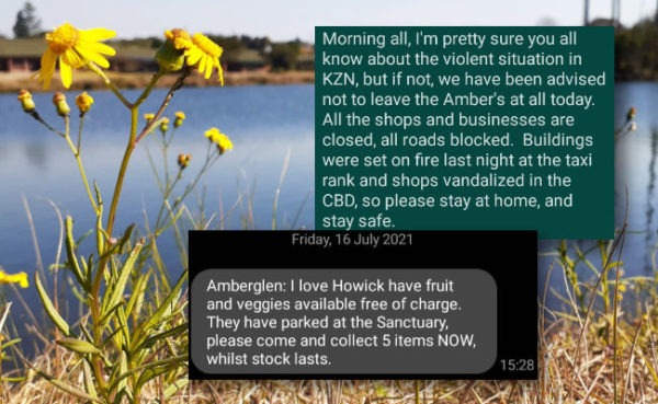 “Ja, Howick was ’n brandpunt van ’n angswekkende week, maar die gemeenskap het mekaar wonderlik ondersteun. Ek is bly ek woon in Howick.”