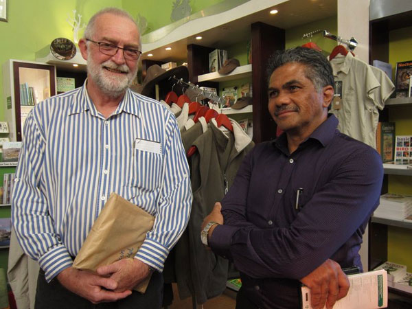 Publisher Robin Stuart-Clark (left) and Eugene Brandt in conversation at the South African Flowering Trees launch at Kirstenbosch |