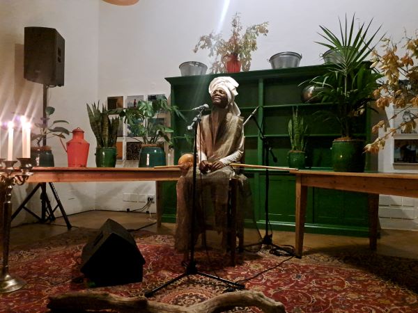 Ons laaste stop is by Odwa Bongo. Hy speel op ’n Uhadi-kalbas met ’n strykstok en snaar, ’n tradisionele Xhosa-instrument. Die klanke is melankolies en strelend en voer jou ver heen, terwyl die kerse in die hoeke flikker.
