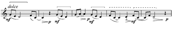 Hierdie lied vertoon die sterk invloed van die pentatoniek, wat gewoonlik met idilliese landelikheid of volksmusiek geassosieer word. Die “lied” begin met ’n pentatoniese drienootformasie wat bestaan uit ’n mineur derde plus ’n heeltoon (met kantige hakies in voorbeeld 1 gemerk). Die gebroke hakies dui op variante waar die note anders gerangskik is as in die eerste pentatoniese motief.29 Soos by die meeste van Grové se musiek speel kort melodiese motiewe ook hier ’n belangrike rol in die fatsoenering van die melodie. Die kontoere is oorwegend dalend, ’n soort melodiese fisionomie wat as tipies van Afrika-musiek beskou word.