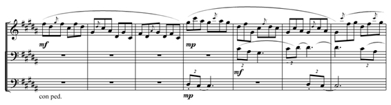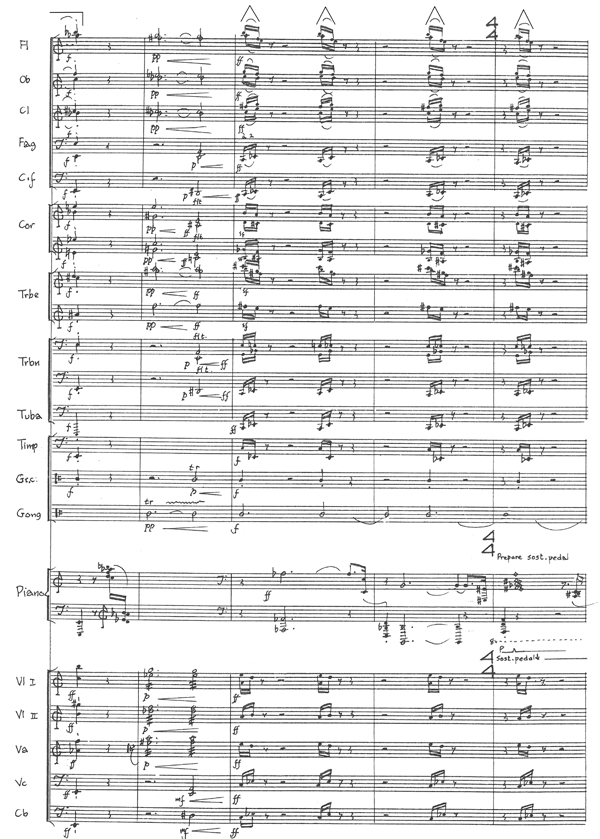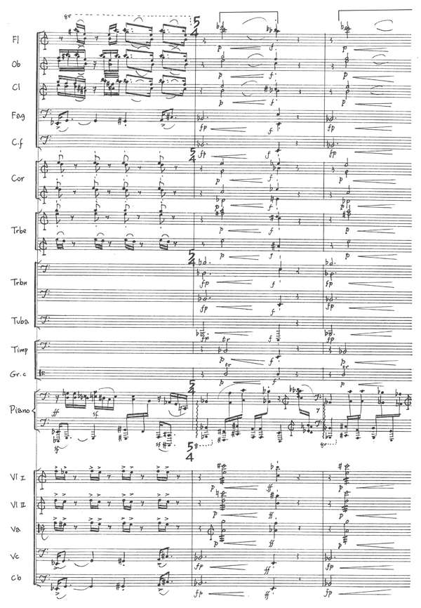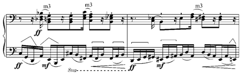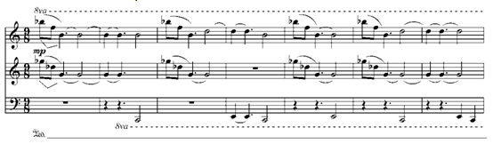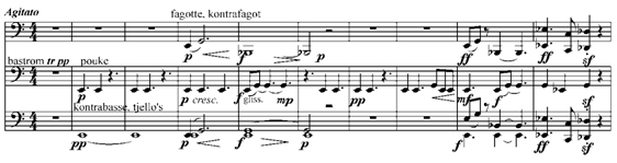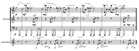 In die nuwe melodiese materiaal wat die klavier speel, word die “gekontamineerde” Raka-motief met die tritonus as tweede interval deur albei hande gespeel, maar nou beweeg die motief in ’n parallelle beweging, ’n majeur tiende uitmekaar. Op ’n lae dinamiese vlak, mp, verhoog hierdie verdubbelde melodiese figuur die dreigende effek van die Raka-motief, ook omdat dit geprojekteer word teen die agtergrond van spookagtige fluittone (flaggeolettone of “harmonics”) van die strykers, wat ’n surrealistiese effek skep. (Luister hier by 7’44”.)