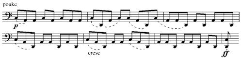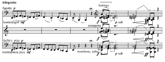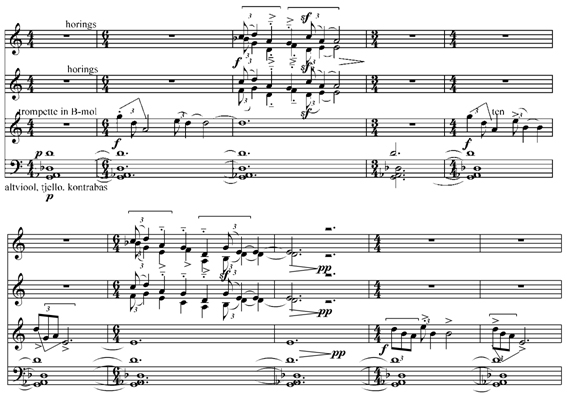 Ook wat die organisasie van toonhoogte betref, word die effek van naderende onheil uitgebeeld. Na die sagte, aangehoue lae E in mate 1–3, vergesel van ’n baie sagte bastromrol, is die openingsinterval in maat 4 ’n stygende mineur derde (E–G, kyk voorbeeld 2a).30 Dit is die spieëlbeeld (omkering) van die eerste interval in die vrouens se rustige lied in die eerste deel, wat ’n dalende mineur derde was (G–E in voorbeeld 1). Die rustigheid word sodoende “omgekeer”. In die tweede deel word ’n meer aggressiewe effek derhalwe reeds deur die stygende kontoer geskep, veral omdat dit met ’n stygende klanksterkte (crescendo) gekoppel word. Die crescendo in maat 4 mond uit in ’n vertikale konstruksie (E,G,B b), gemerk f en ffp, wat die tritonus as buitelyn het. (Die trombone, wat E en G ffp speel, is nie in voorbeeld 2a betrek nie.) ’n Onopgevulde, duidelik sprekende vertikale tritonus wat geaksentueer en staccato gespeel word (Db,G), kristalliseer in maat 103 uit na ’n crescendo wat in die bastrom-party gemerk is.31
