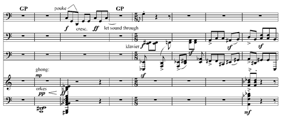 The fourth part of Grové’s Raka is entitled “Koki and the combat with Raka”. It begins with a powerful descending Raka figure played by the trumpets. Clamorous brass playing and brutal virtuoso passages played by the pianist at a fast tempo depict the confrontation. The pentatonic melodic motif associated with Koki is still heard, but now entangled within Raka’s music. Although it appears as the top layer of the sound band, it loses its character because it is played by the instruments associated with Raka, the loud brass instruments. Also, the tritone that symbolises evil progressively infiltrates Raka’s music.