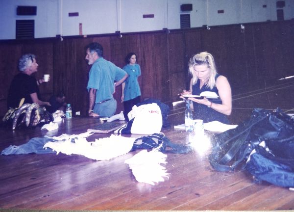 Tydens ’n kleedrepetisie: Antoinette Kellermann, Breyten Breytenbach, ’n verhoogbestuurder in die agtergrond en Grethe Fox regs voor. (Foto: verskaf)