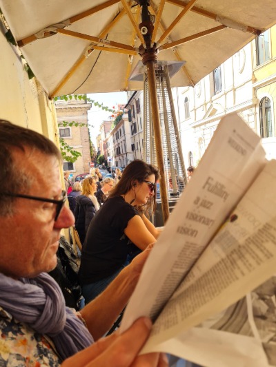 Koerante en koffie op Lida se roete in Rome