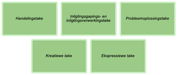 Handelingstake dra tot die ontwikkeling en integrasie van die liggaamlik-kinestetiese en naturalistiese intelligensies by, byvoorbeeld die uitvoer van instruksies en die invul van vorms. Die tweede kategorie is inligtingsgapings- en inligtingsverwerkingstake wat die ontwikkeling en integrasie van die visueel-ruimtelike, logies-wiskundige en linguistiese intelligensies behels, byvoorbeeld die saamstel van lyste en klassifisering. In die derde plek vind ons probleemoplossingstake wat die logiese wiskundige en linguistiese intelligensies ontwikkel en integreer, wat beplanning en raaisels insluit. Kreatiewe take is die vierde kategorie en ontwikkel en integreer die linguistiese, visueelruimtelike en inter- en intrapersoonlike intelligensies; advertensies, plakkate en onderhoude is almal voorbeelde van kreatiewe take. Ekspressiewe take is die laaste kategorie en is daardie take wat die inter- en intrapersoonlike intelligensies integreer en ontwikkel, en sluit dagboekinskrywings en vraelyste in.