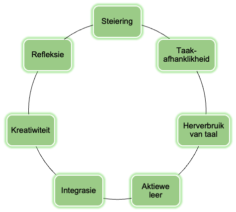 Steiering/ondersteuning kom daarop neer dat beide die lesse en lesmateriaal ’n ondersteunende raamwerk moet verskaf waarbinne die beste moontlike leer kan plaasvind. Taakafhanklikheid het as kern dat een taak met ’n ander taak moet skakel en ontwikkel. Lesse is gewoonlik eers ontvanklik en later produktief. Die derde beginsel onderskryf die feit dat geleenthede vir leer deur die herverbruik van taal vermeerder word. In die vierde plek moet leer aktief wees – leerders moet die kans gegun word om die taal te gebruik; dit is die leerder wat interaktief met taal besig is. Die vyfde beginsel behels dat die formele en funksionele aspekte van taalonderrig geïntegreerd moet plaasvind, terwyl die sesde beginsel fokus op die feit dat nabootsing tot iets nuuts moet lei. Reproduksietake moet só ontwerp word dat dit die grondslag vir kreatiewe take vorm waar die leerders al die bekende dele verenig om self taal te skep. Die laaste beginsel fokus op refleksie – leerders moet die geleentheid gegun word om te besin oor dit wat hulle geleer het én hoe suksesvol hulle was (Van der Hoven 2023:27).