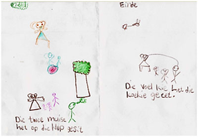Findings show that learners have a keen appreciation of the spoken form of language in that they listened keenly to the stories. One group showed special enthusiasm for retelling stories that they had heard at home. Another aspect of the programme to which learners responded enthusiastically was the activity of illustrating little books; this they appeared to enjoy more than writing them. Enthusiastic responses of learners are important because learning is much more likely to proceed successfully if learners enjoy the developmental activities. Learners’ levels of linguistic awareness regarding genre, register and grammatical aspects such as spelling differed considerably. In their little books they showed varying degrees of dependence on the already familiar genres of fables and fairy tales. Regarding writing conventions, they also showed varying degrees of awareness of, for example, appropriate punctuation. Interesting examples of regional language use which included phonological awareness of the spoken form occurred, as for example in spelling the word “broer” as “broeg”, reflecting sensitivity to local distribution of the rhotic (uvular fricative [R]), instead of the alveolar trill [r]. There were interesting findings regarding the influence that learners’ life experiences have on their narrative products. The picture sequencing activities reflected learners’ creative use of familiar everyday events and artefacts to make sense of elements unfamiliar to them. Quite a number of instances are recorded in which learners did not recognise particular images (such as a simplified and dated version of a rocket landing on the moon), or did not have access to information underlying a certain picture sequence (such as the development of a butterfly from a chrysalis). The ways in which learners put effort into making meaning of what was presented to them testifies to linguistic awareness that deserves to be recognised and rewarded.