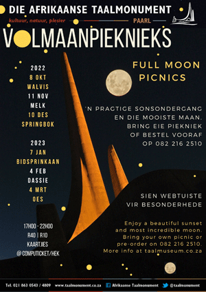 • Vir meer inligting oor al die ander opwindende geleenthede, konserte en kursusse by die Taalmonument en Taalmuseum, skakel 021 872 3441/863 0543, besoek www.taalmonument.co.za of volg hulle op Facebook. Die webtuiste bied boonop virtuele toere van die monument en museum, inligting in ses tale oor die simboliek van die Taalmonument asook baie interessante artikels oor Afrikaans, veeltaligheid en die instelling se verlede, hede en toekoms. Daar is voorts heelwat bronne vir skool- en navorsingsprojekte. Jaarpermitte kos slegs R120 vir individue of R220 per gesin, wat toegang tot alle Volmaanpieknieks insluit. Die ATM Koffiehuis bied daagliks heerlike kos en pragtige vergesigte.