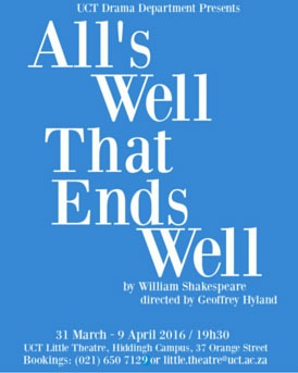 In die drama gaan dit om Helena (uitgespreek Helen; vertolk deur Naledi Majola) se sterk liefde vir Bertram (Tristan de Beer). Hy is die seun van die waardige, wyse Hertogin van Rousillon (Lulu Read) wat vir Helena onder haar sorg geneem het, vir haar soos ‘n moeder wil wees. Dis ’n grys gebied, want dit sal beteken dat Bertram haar broer is en hulle daarom nie kan trou nie. Hulle word in ’n huwelik ingedwing deur die Franse koning. Dis ’n beloning vir Helena wat hom genees het met medikasie van haar oorlede vader, ‘n beroemde dokter. Maar gelukkig is daar ’n oorlog te voer en Bertram ontvlug aan die huwelik. Hy is egter heel belustig (uitstekend vertolk) om ’n nag in ’n donker bed met Diana (Nicola Moerman) deur te bring. Helena bewimpel dat sý Diana se plek inneem. Hierna volg ’n intrige met ringe sodat die koning Bertram vir moord laat arresteer en Diana ook ’n verdagte word.