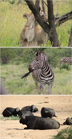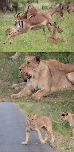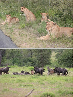 Dit het gevoel of ek binne ’n inry-fliek sit, terwyl tonele reg rondom ons afwissel. Reuke en gromgeluide ’n werklikheid. Aan die linkerkant was ’n groot watergat waar diere gereeld drink. Aan ons regterkant lang grasse met sade vol in dinamiet en digbegroei. Die bosveld asemrowend groen. Asof betower en in stil verwondering bly ons oë vasgevang op dit wat voor ons afspeel: