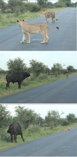 Dit was die begin van ’n kat-en-muis speletjie. Wanneer die leeus padgee, sou die buffels asof in beurte een-een vorentoe storm, en wanneer die leeus omdraai en gaan l?, sou die voorste buffel skielik terug-spring. Toe split die leeus op. Was dit om die buffels weg te lei van die kleiner wild agter, of het die buffels dit reggekry om die leeus uit mekaar te dryf?