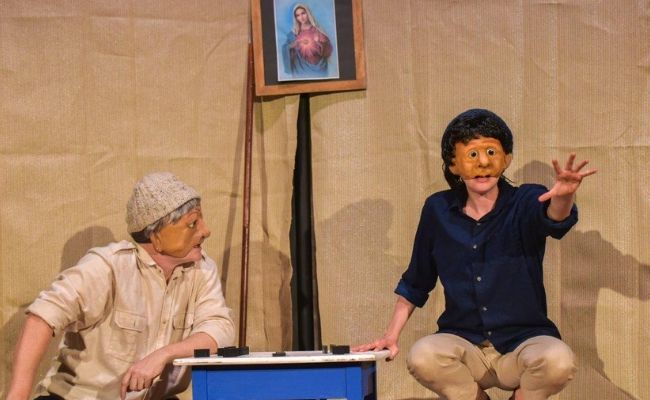 Die res van die toneelstuk dra die akteurs swaar, amper komiese maskers, wat teatergangers ontneem van die voorreg om hul gesigsuitdrukkings te sien. Hier moet hul fisiese bewegings en stemtoon vergoed.