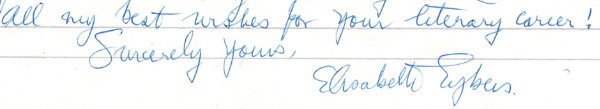 With all that going on, I must have forgotten about The beadle. Five years later, it was packed into a box and transported to Johannesburg, where it took up a new place on yet another bookcase, between The big sleep and Portnoy’s complaint. If Doris Lessing thought reading a book 20 years after you’d bought it was perfectly acceptable, when I took it down and opened it the other day, I realised it had been waiting forlornly on my various bookshelves for 35 years. Then I saw the inscription above my name and the date of purchase. I obviously hadn’t paid close attention at the time. What did it mean? Pauline Smith died in 1959, so she couldn’t literally have given instructions in 1970 to MAB – whoever that was – to give the book to Elisabeth Eybers.