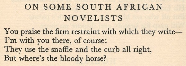 If a slightly misogynist tone seeps through in his reference to “women-writers”, that can be ascribed to how he felt towards the popular novelist Sarah Gertrude Millin, who was soon to become the butt of his most famous and stinging epigram, “On some South African novelists”.