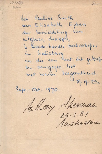 But who was the mysterious MAB who, on a visit to Rhodesia, had paid 4/6 to a second-hand bookdealer in Salisbury – either The Treasure Trove or The Book Exchange, according to my informants – and “passed it on with warm affection”? If anyone knew the answer to that question, it would be Ena Jansen. Ena is, among many things, an eminent Eybers scholar, who became her friend and, in 1996, wrote the outstanding Afstand en verbintenis (Distance and connection) about Eybers’s life and work in Amsterdam. She told me MAB was Marié Antoinette Botha, whose married name was Bax. Although she was three years older than Eybers, they’d both studied at Wits in the 1930s and remained close friends, and after Eybers settled in Amsterdam in 1961, Marié often stayed with her in the Van Breestraat.