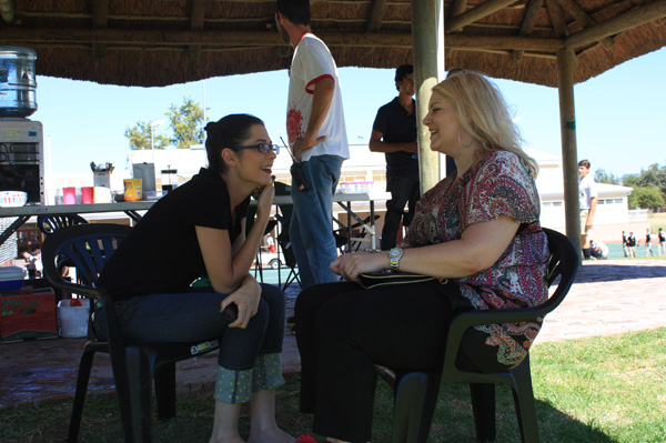 Diedericks-Hugo (regs) druk in gesprek met Jackie Hancke.