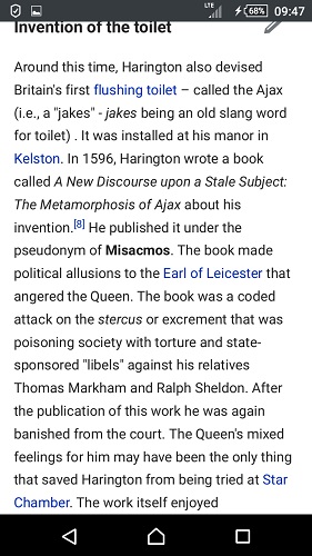 Die Mayas en Romeine het al binnenshuise baddens en toilette gehad. Daar was ook klasseverskille in Brittanje. Die lae klas het hul slopemmers in straat uitgegooi, ook Franse. Spoeltoilette was al in gebruik voor Van Riebeeck in 1652 aan Kaap sy groentewinkel en slaghuis oopgemaak het.