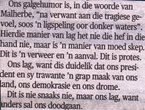 Hy moet ernstig daaroor wees om vir Nr 1 orals in die bresse te tree, al is dit met galgehumor. Vergelyk hierdie brief van hom in my geliefkoosde Sondagkoerant:
