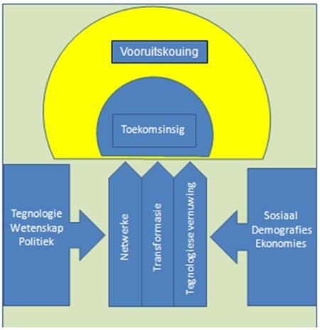 ’n Verskeidenheid metodes kan aangewend word om die kennisvermoëns wat toekomsinsig onderlê, te genereer. In hierdie artikel word ’n raamwerk vir sodanige model voorgestel. Die soeke na toekomsinsig kan plaasvind indien die oorhoofse dryfkragte wat ’n bepalende invloed op die toekoms kan hê, geïdentifiseer word. Die tegnologiese/wetenskaplike, ekonomiese, demografiese, politieke en sosiale omgewings waarbinne menslike aktiwiteit plaasvind, genereer die dryfkragte.