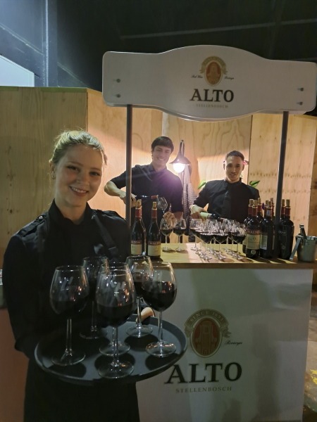 Isabella Nagel, Divan Erasmus en Reeve Warley hou die glasies vol by die Alto-stalletjie. (Foto: Clifford Roberts)