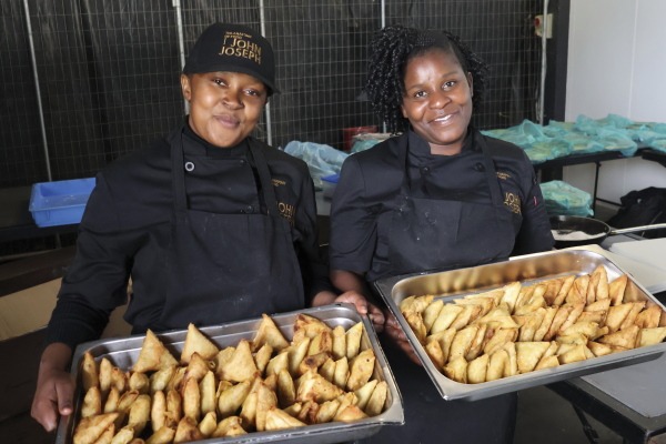 Daar was ’n groot braaifees binne-in die saal, maar agter die skerms het die kombuis ook gekook! Hier is Nkosi Watinye en Pamela Chadongo besig om samoesas te diepbraai. (Foto: Clifford Roberts)